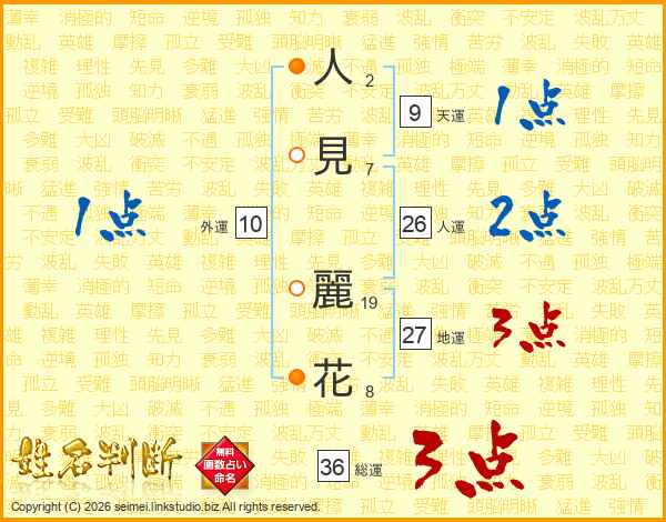 人(2画)見(7画) 麗(19画)花(8画)