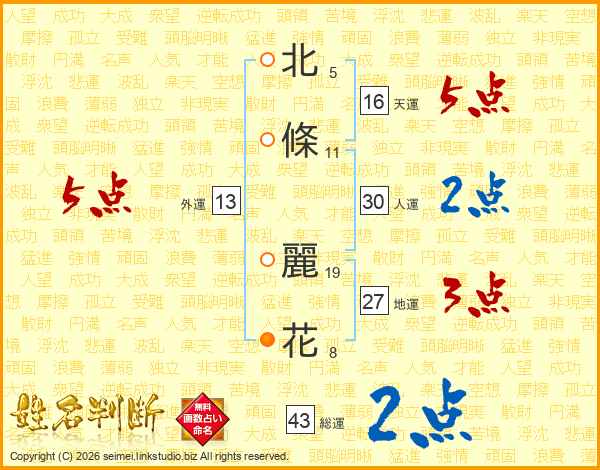 北條麗花さんの総運は43画の2点!