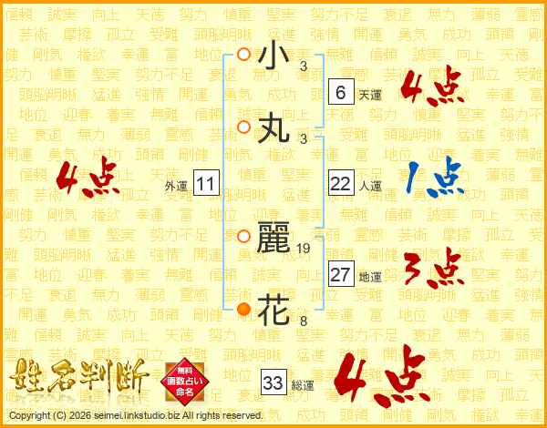 生活面を象徴する運勢です。外部から受ける影響力を表し、結婚運、家庭運や職場、環境への順応性を表します。総運から人運を引いた画数。姓や名が1文字の場合を除く。