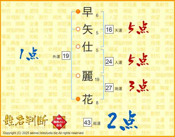 早(6画)矢(5画)仕(5画) 麗(19画)花(8画)