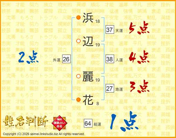 浜(18画)辺(19画) 麗(19画)花(8画)