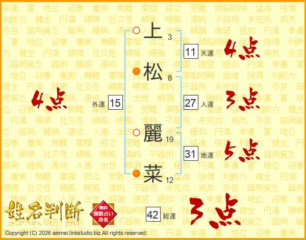 生活面を象徴する運勢です。外部から受ける影響力を表し、結婚運、家庭運や職場、環境への順応性を表します。総運から人運を引いた画数。姓や名が1文字の場合を除く。