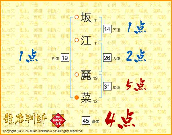 坂(7画)江(7画) 麗(19画)菜(12画)