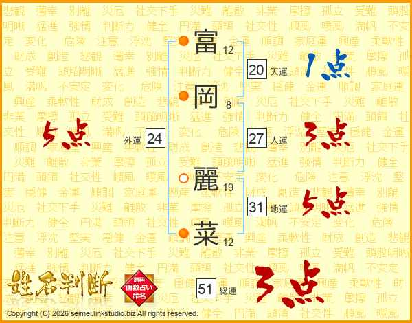 富(12画)岡(8画) 麗(19画)菜(12画)