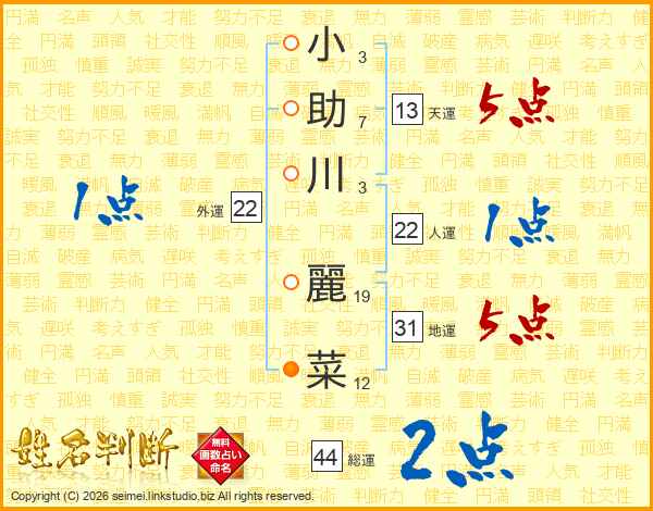 小(3画)助(7画)川(3画) 麗(19画)菜(12画)