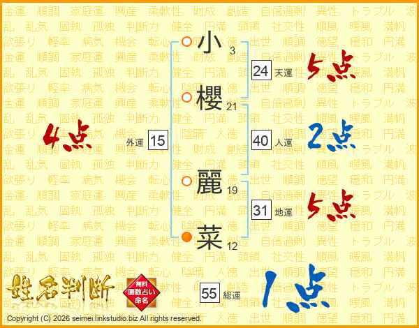 小(3画)櫻(21画) 麗(19画)菜(12画)