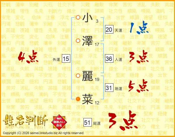小(3画)澤(17画) 麗(19画)菜(12画)