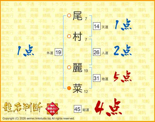 尾(7画)村(7画) 麗(19画)菜(12画)