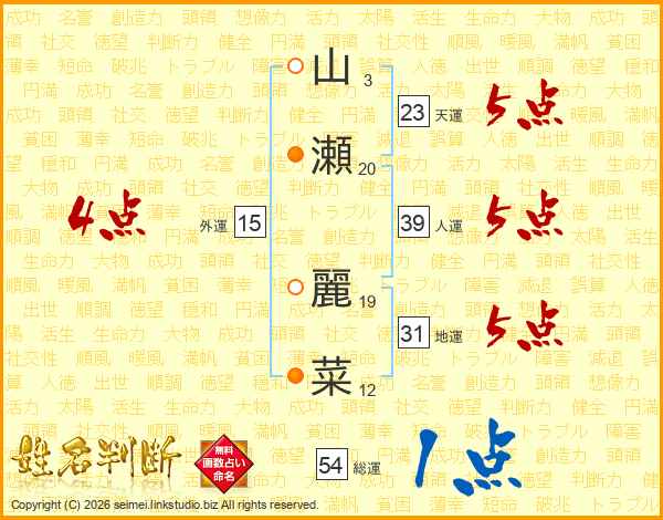 山(3画)瀬(20画) 麗(19画)菜(12画)