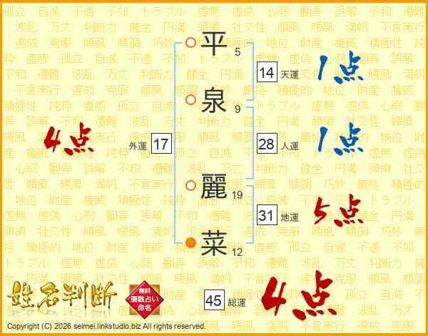平泉麗菜さんの総運は45画の4点!