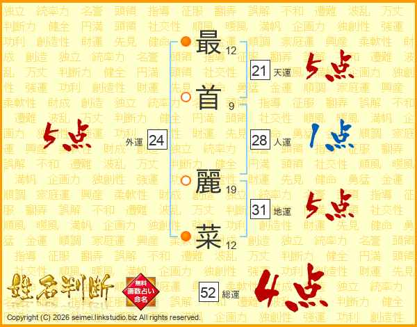 最首麗菜さんの総運は52画の4点!