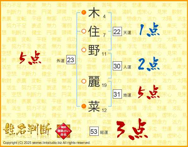 木(4画)住(7画)野(11画) 麗(19画)菜(12画)