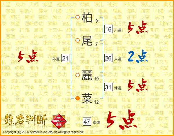 柏(9画)尾(7画) 麗(19画)菜(12画)