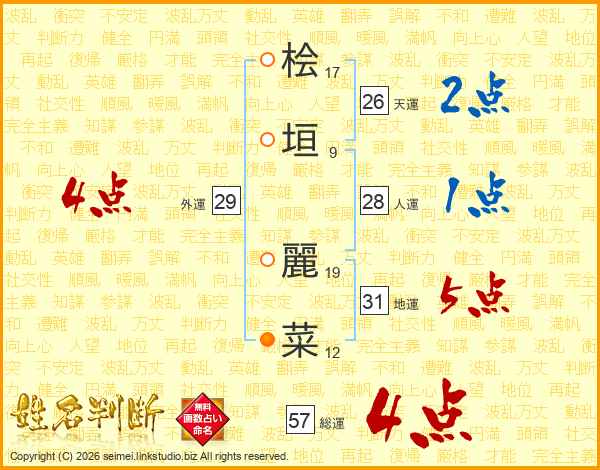 桧垣麗菜さんの総運は57画の4点!