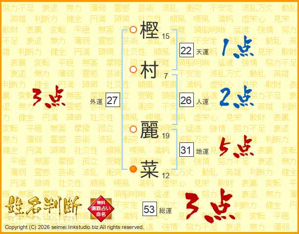 樫(15画)村(7画) 麗(19画)菜(12画)