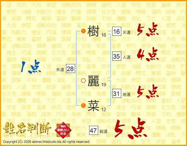 樹麗菜さんの総運は47画の5点!