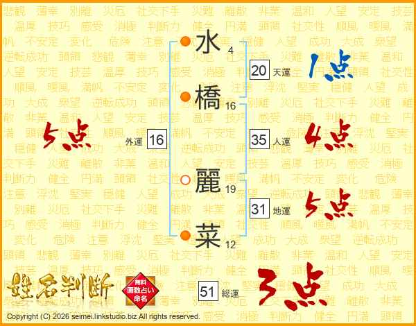 水(4画)橋(16画) 麗(19画)菜(12画)