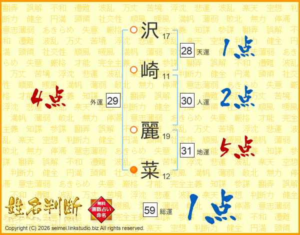 沢(17画)崎(11画) 麗(19画)菜(12画)
