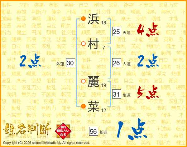 浜(18画)村(7画) 麗(19画)菜(12画)