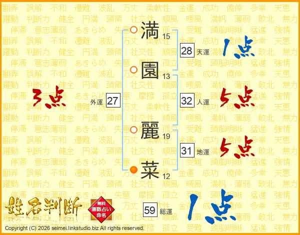 満(15画)園(13画) 麗(19画)菜(12画)