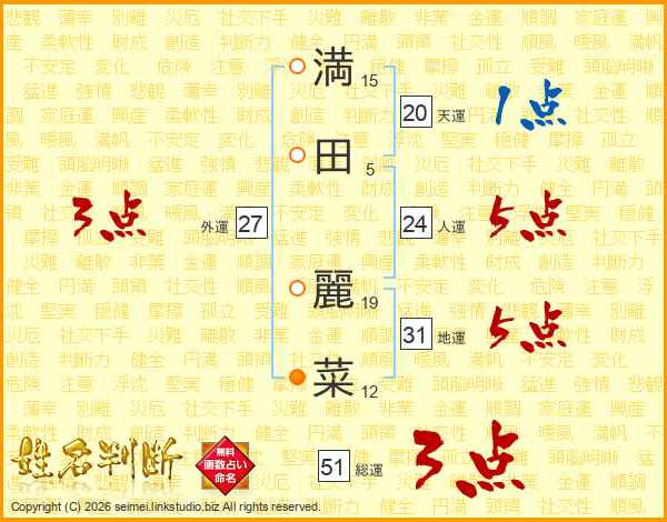 生活面を象徴する運勢です。外部から受ける影響力を表し、結婚運、家庭運や職場、環境への順応性を表します。総運から人運を引いた画数。姓や名が1文字の場合を除く。