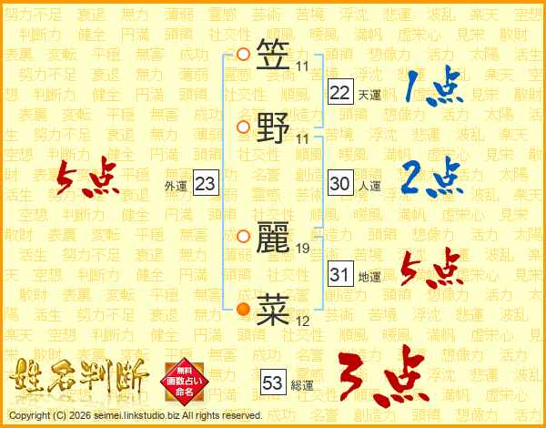 笠野麗菜さんの総運は53画の3点!