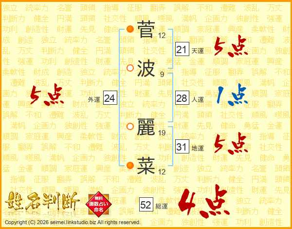 菅波麗菜さんの総運は52画の4点!