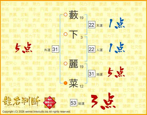 藪(19画)下(3画) 麗(19画)菜(12画)