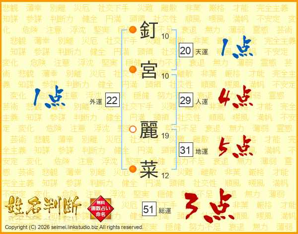 釘宮麗菜さんの総運は51画の3点!