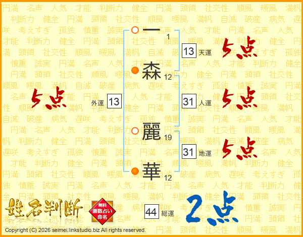 生活面を象徴する運勢です。外部から受ける影響力を表し、結婚運、家庭運や職場、環境への順応性を表します。総運から人運を引いた画数。姓や名が1文字の場合を除く。