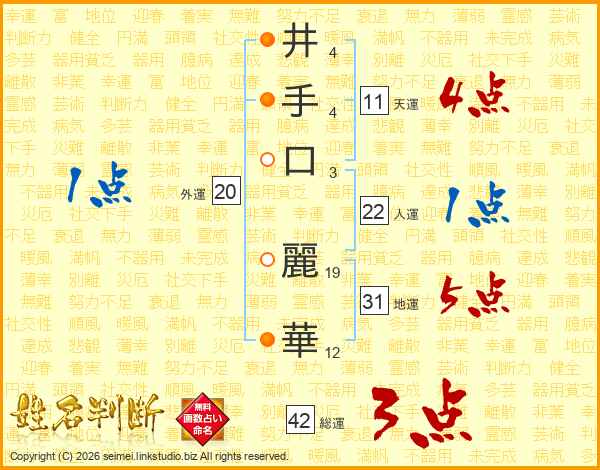 井(4画)手(4画)口(3画) 麗(19画)華(12画)