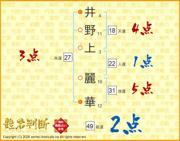 井(4画)野(11画)上(3画) 麗(19画)華(12画)