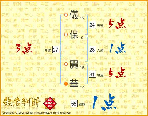 生活面を象徴する運勢です。外部から受ける影響力を表し、結婚運、家庭運や職場、環境への順応性を表します。総運から人運を引いた画数。姓や名が1文字の場合を除く。