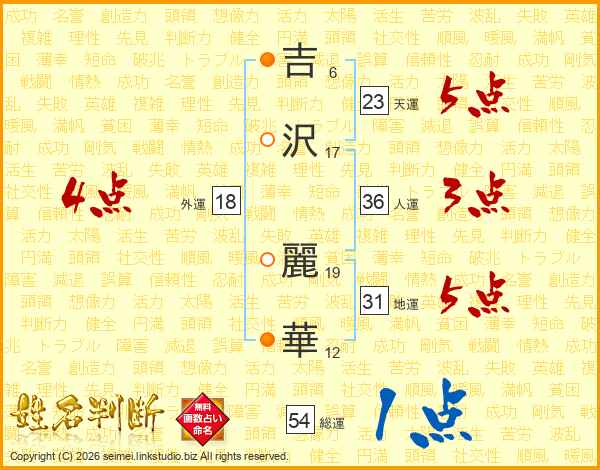 吉(6画)沢(17画) 麗(19画)華(12画)