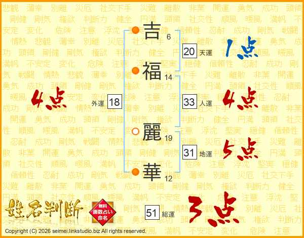 生活面を象徴する運勢です。外部から受ける影響力を表し、結婚運、家庭運や職場、環境への順応性を表します。総運から人運を引いた画数。姓や名が1文字の場合を除く。