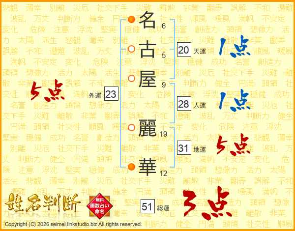 名(6画)古(5画)屋(9画) 麗(19画)華(12画)