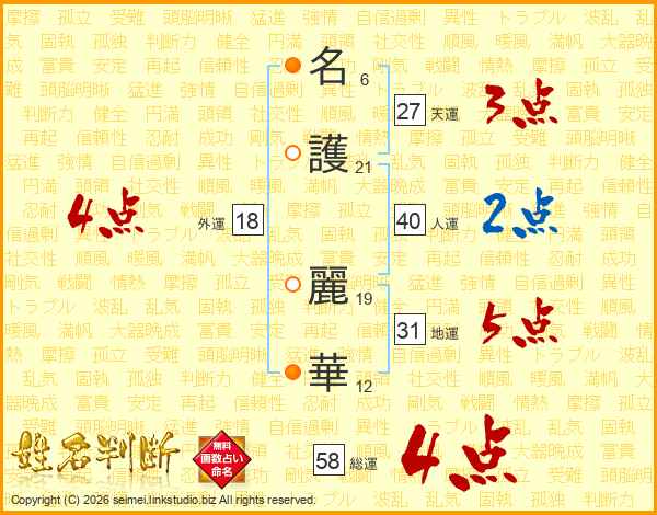 名(6画)護(21画) 麗(19画)華(12画)