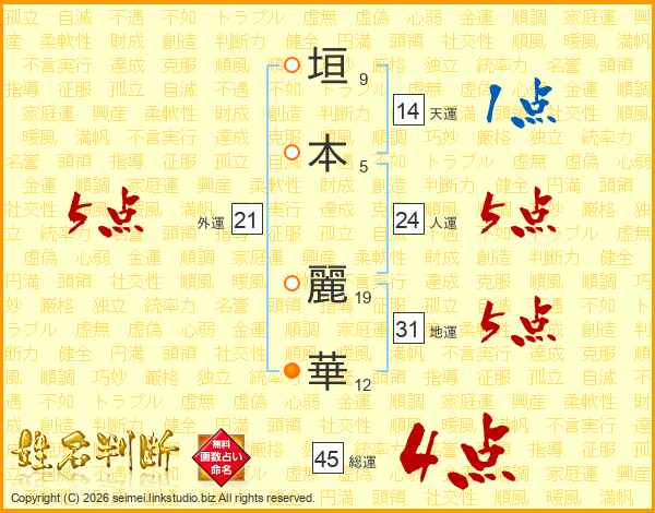 垣(9画)本(5画) 麗(19画)華(12画)