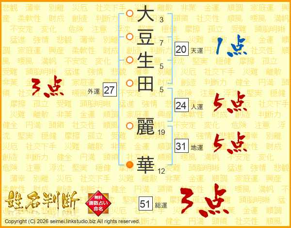 大(3画)豆(7画)生(5画)田(5画) 麗(19画)華(12画)
