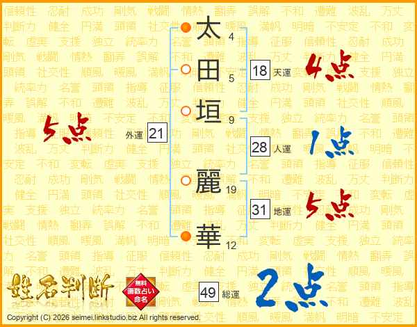 太田垣麗華さんの総運は49画の2点!