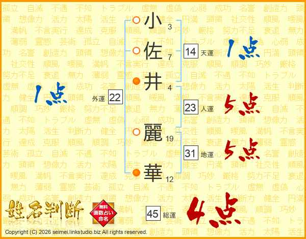 小(3画)佐(7画)井(4画) 麗(19画)華(12画)