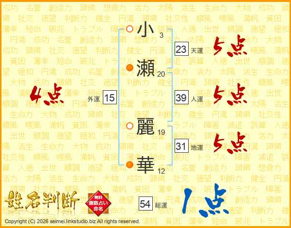 小(3画)瀬(20画) 麗(19画)華(12画)