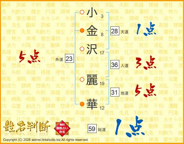 小(3画)金(8画)沢(17画) 麗(19画)華(12画)