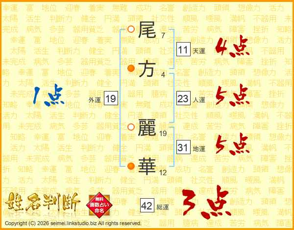 尾(7画)方(4画) 麗(19画)華(12画)