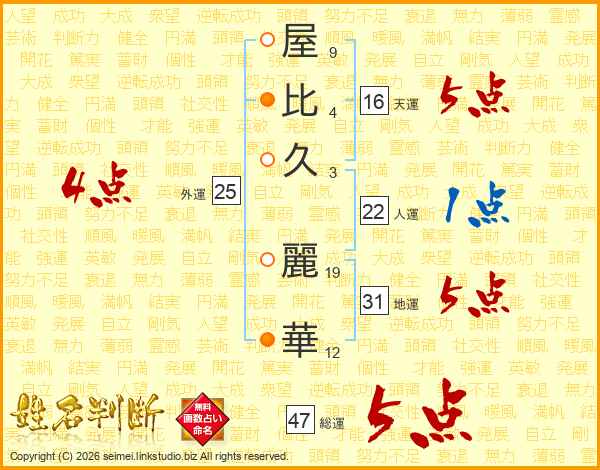 屋(9画)比(4画)久(3画) 麗(19画)華(12画)