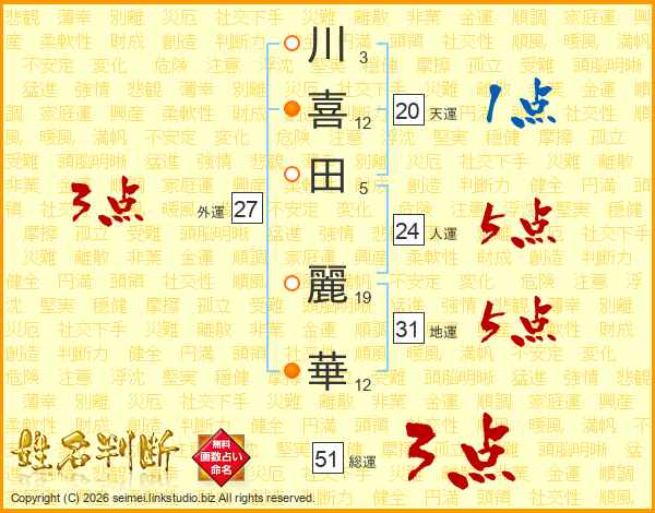 川(3画)喜(12画)田(5画) 麗(19画)華(12画)