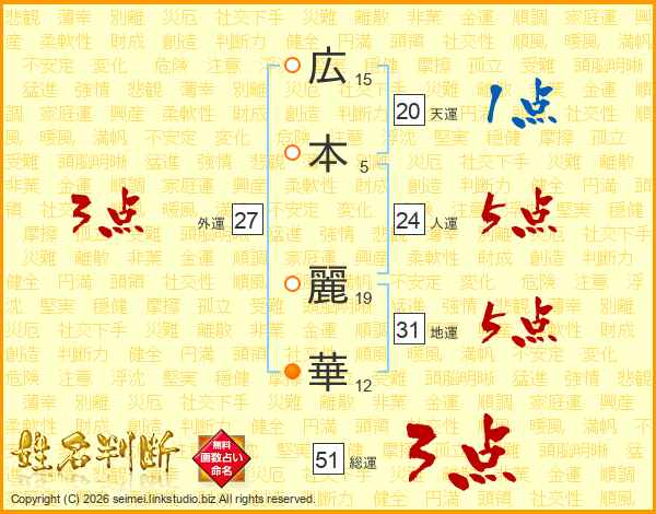 広本麗華さんの総運は51画の3点!