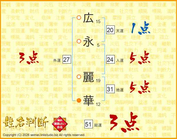 生活面を象徴する運勢です。外部から受ける影響力を表し、結婚運、家庭運や職場、環境への順応性を表します。総運から人運を引いた画数。姓や名が1文字の場合を除く。