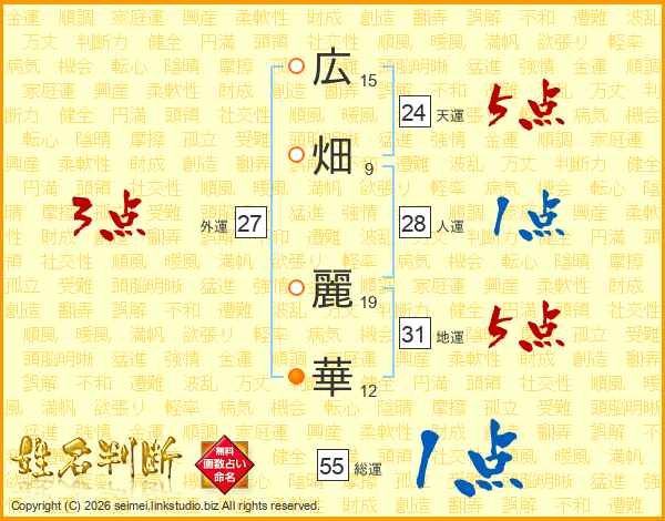 広(15画)畑(9画) 麗(19画)華(12画)
