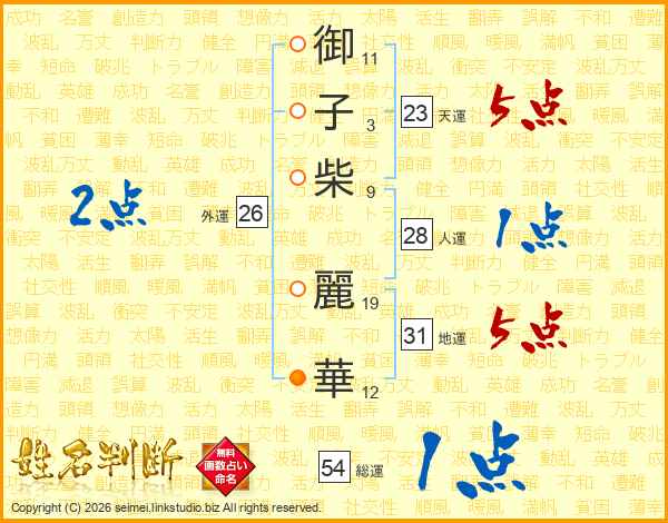 御(11画)子(3画)柴(9画) 麗(19画)華(12画)